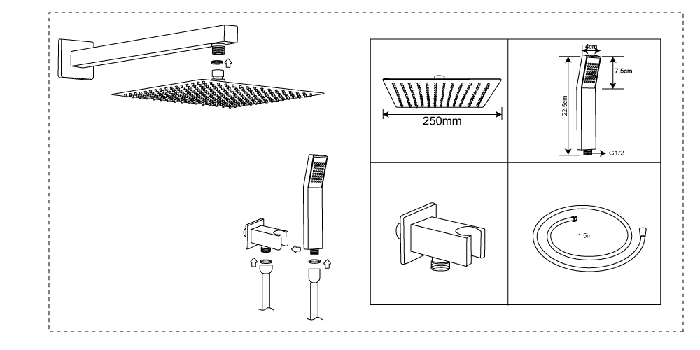 Ensemble de douche encastré Carré 250*250 Chromé – 23102210